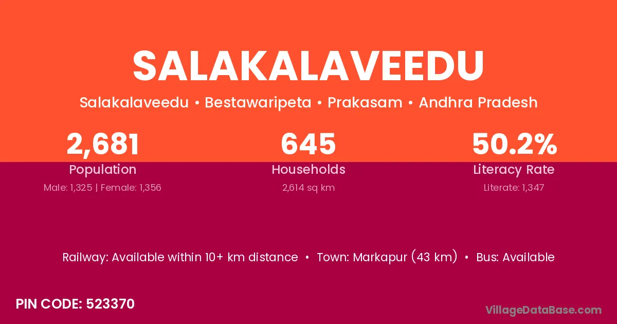 Markapur (43 km) is the nearest town to Salakalaveedu village for major economic activities and is located approximately 43 km away.