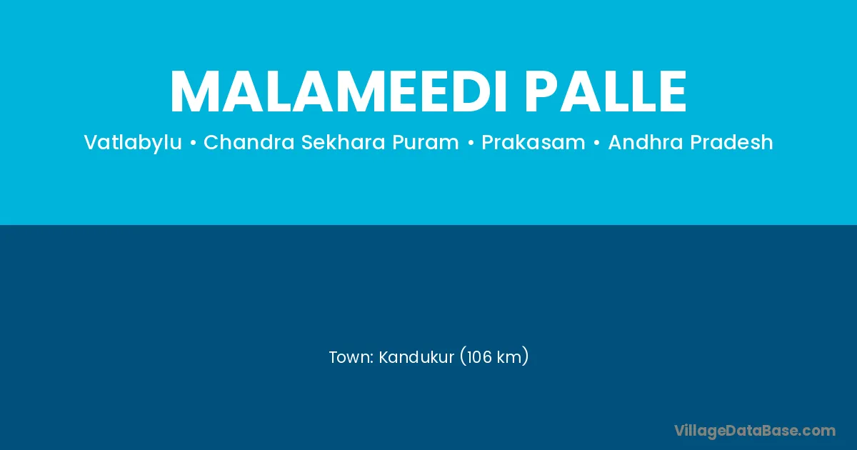 Kandukur (106 km) is the nearest town to Malameedi Palle village for major economic activities and is located approximately 106 km away.