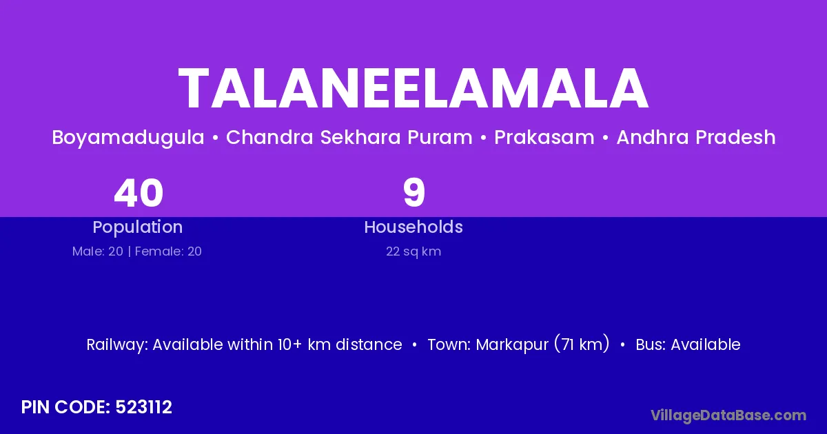 Markapur (71 km) is the nearest town to Talaneelamala village for major economic activities and is located approximately 71 km away.