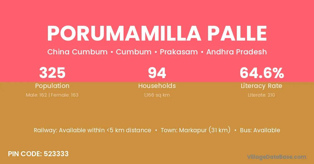 Markapur (31 km) is the nearest town to Porumamilla Palle village for major economic activities and is located approximately 31 km away.