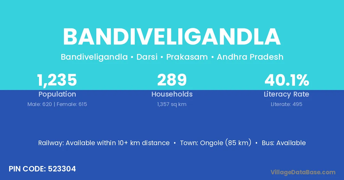 Bandiveligandla village has a total population of 1,235 people, of which 620 are males and 615 are females.
