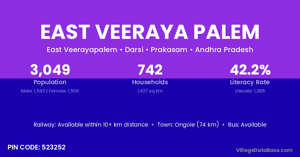 Ongole (74 km) is the nearest town to East Veeraya Palem village for major economic activities and is located approximately 74 km away.