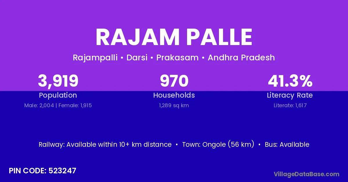 Ongole (56 km) is the nearest town to Rajam Palle village for major economic activities and is located approximately 56 km away.