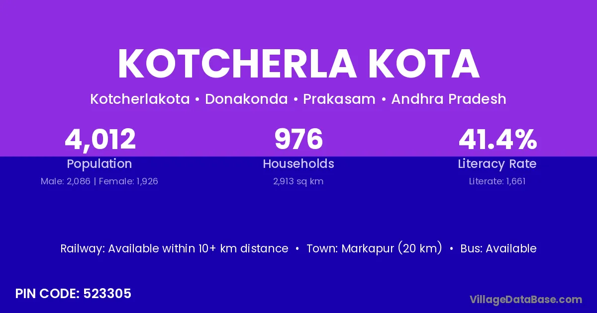 Markapur (20 km) is the nearest town to Kotcherla Kota village for major economic activities and is located approximately 20 km away.