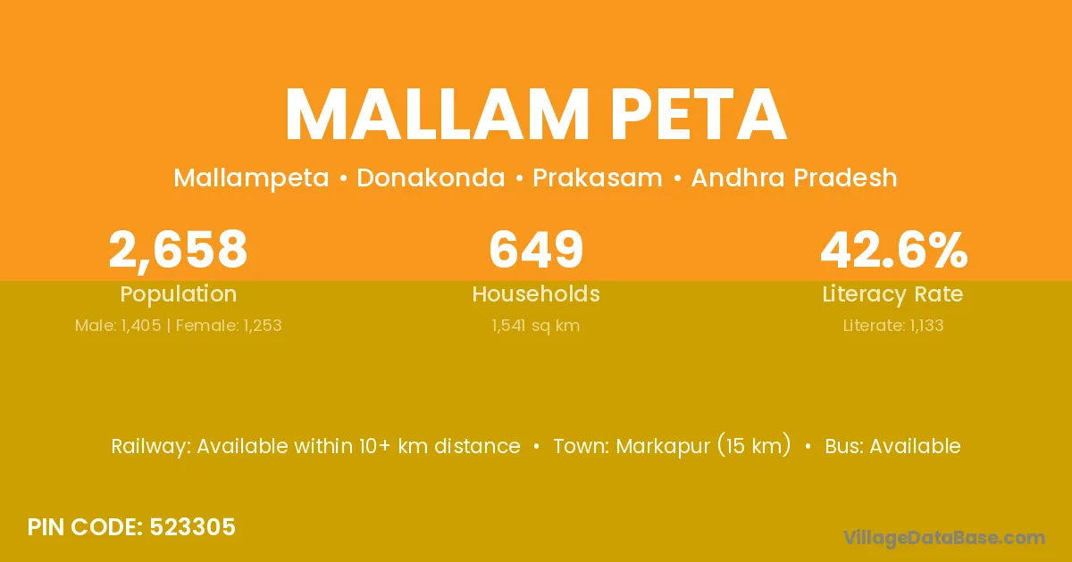 Markapur (15 km) is the nearest town to Mallam Peta village for major economic activities and is located approximately 15 km away.