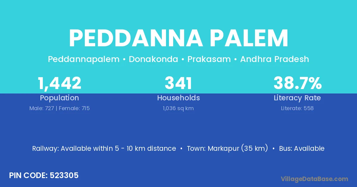 Markapur (35 km) is the nearest town to Peddanna Palem village for major economic activities and is located approximately 35 km away.