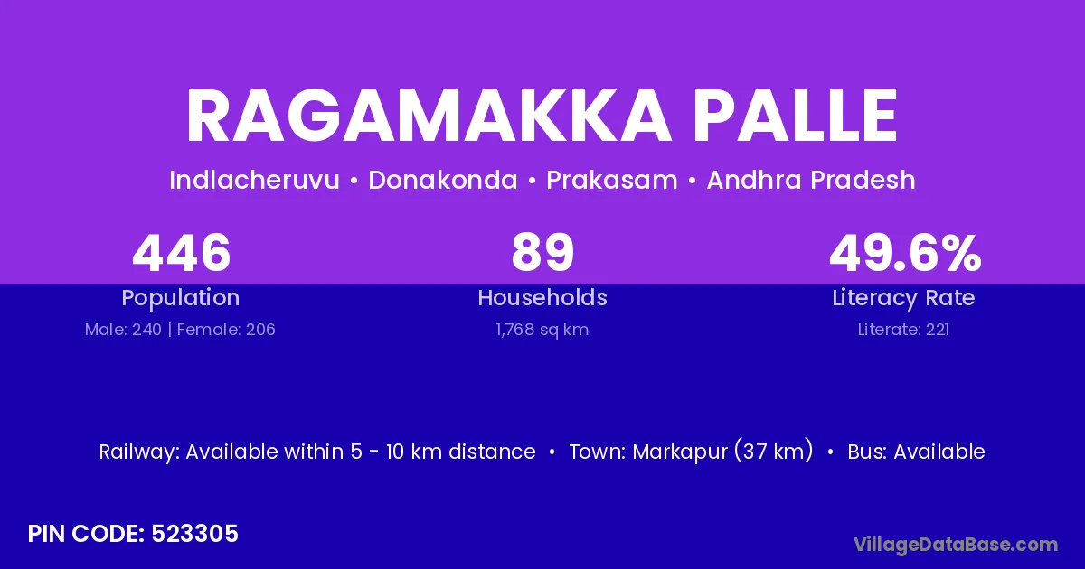Markapur (37 km) is the nearest town to Ragamakka Palle village for major economic activities and is located approximately 37 km away.