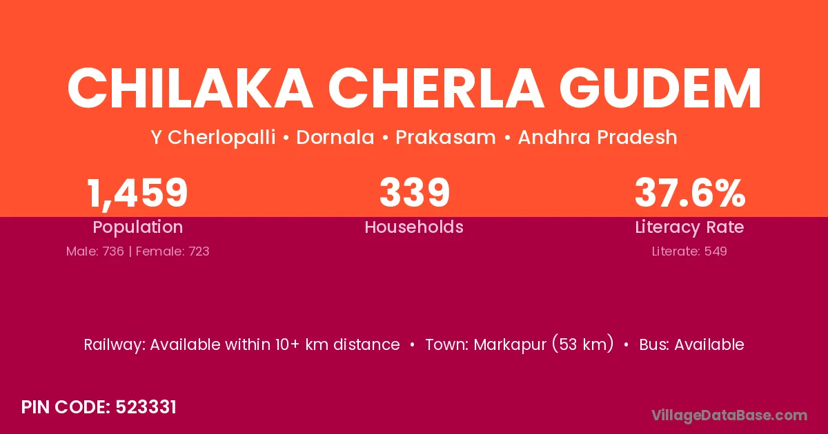 Chilaka Cherla Gudem village has a total population of 1,459 people, of which 736 are males and 723 are females.
