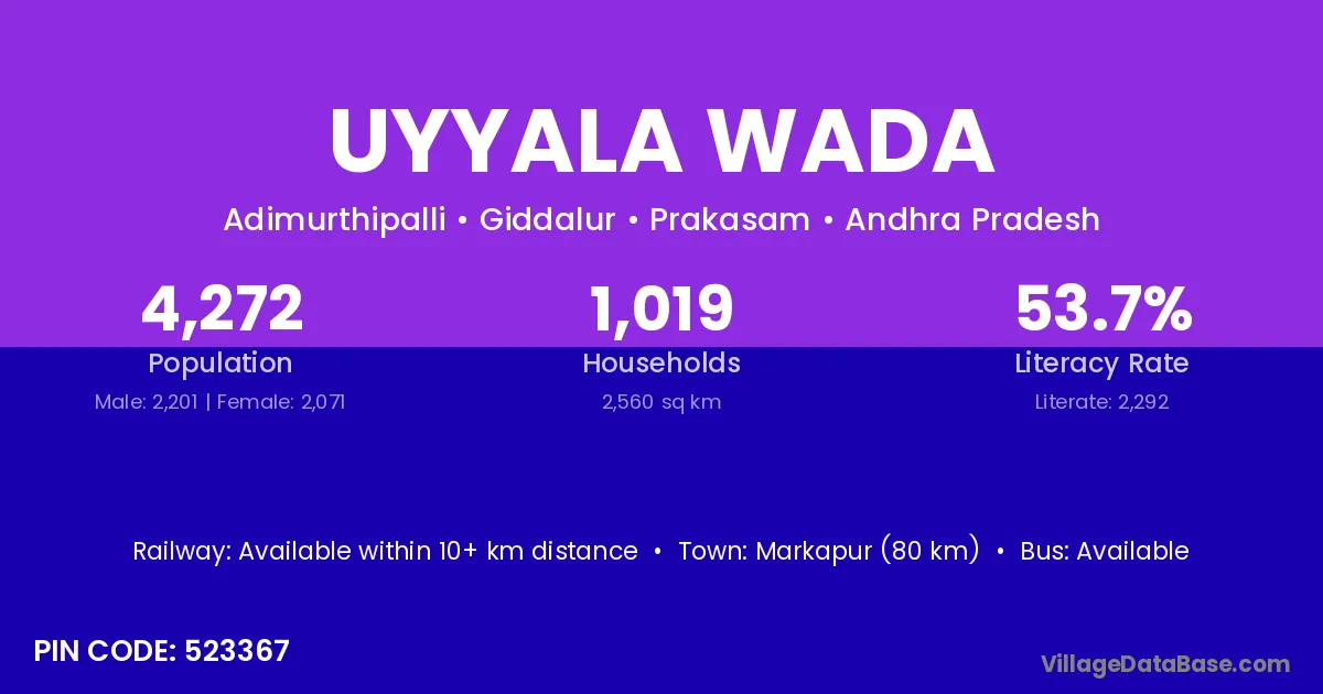 Markapur (80 km) is the nearest town to Uyyala Wada village for major economic activities and is located approximately 80 km away.