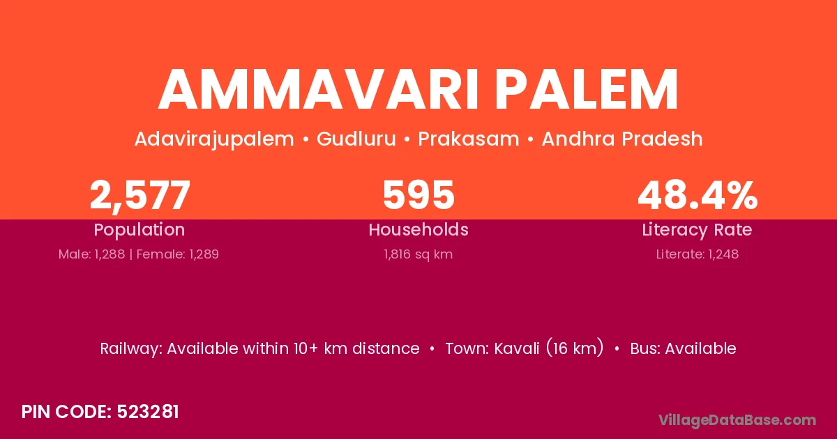 Ammavari Palem village has a total population of 2,577 people, of which 1,288 are males and 1,289 are females.