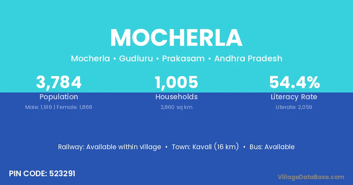 Kavali (16 km) is the nearest town to Mocherla village for major economic activities and is located approximately 16 km away.