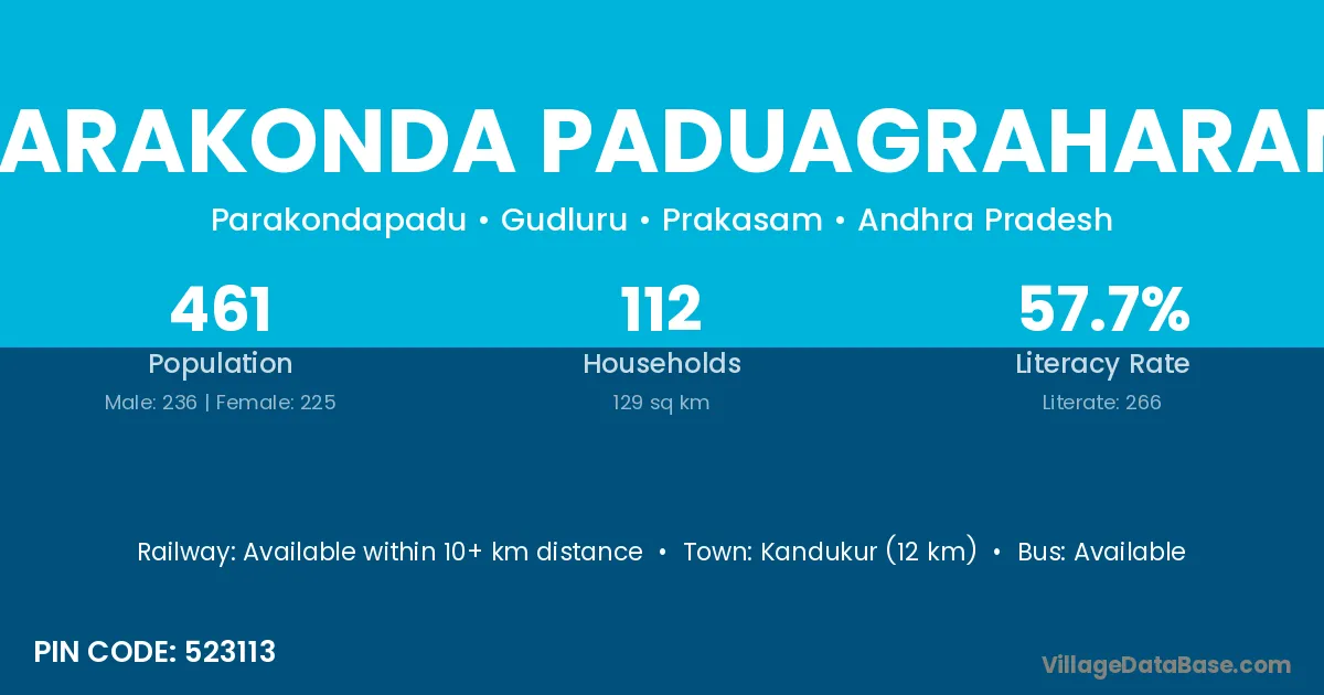 Kandukur (12 km) is the nearest town to Parakonda Paduagraharam village for major economic activities and is located approximately 12 km away.