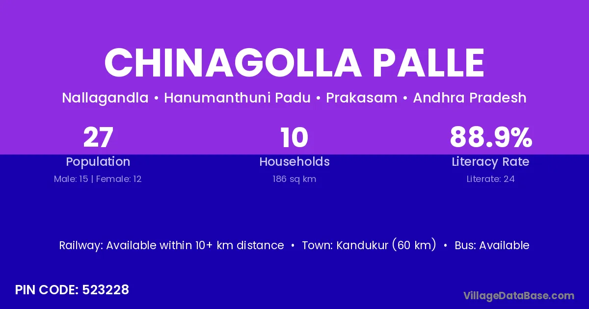 Kandukur (60 km) is the nearest town to Chinagolla Palle village for major economic activities and is located approximately 60 km away.