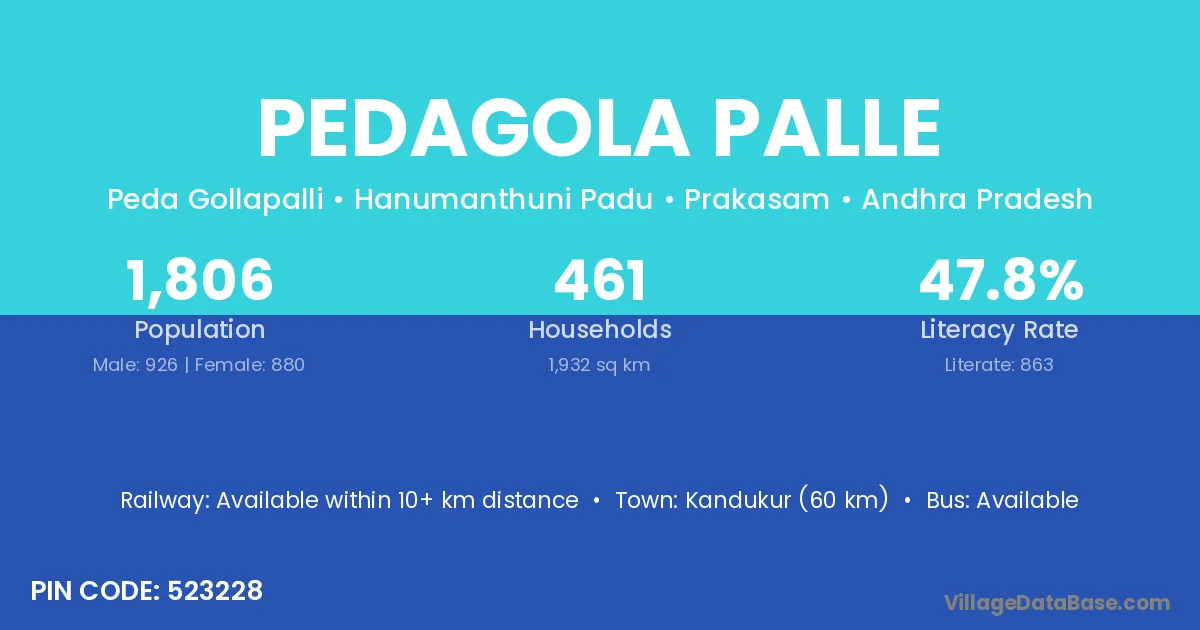 Kandukur (60 km) is the nearest town to Pedagola Palle village for major economic activities and is located approximately 60 km away.