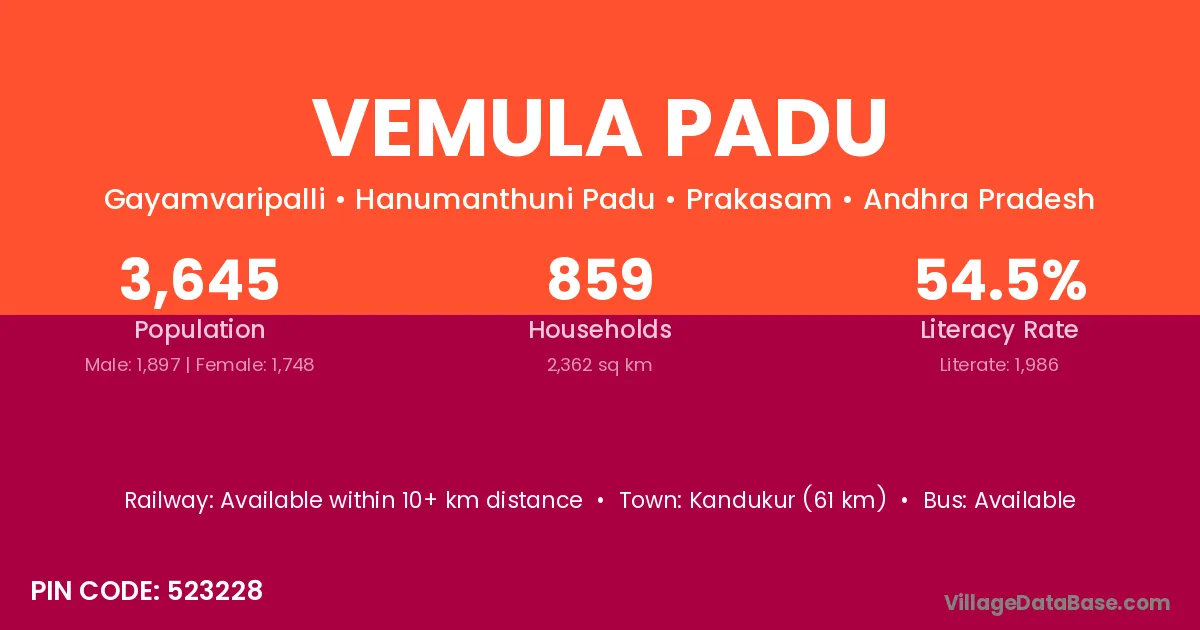 Vemula Padu village has a total population of 3,645 people, of which 1,897 are males and 1,748 are females.