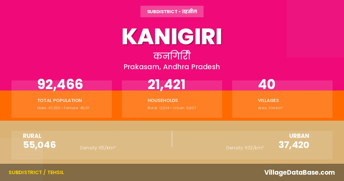 According to the 2011 census The total area of Kanigiri Mandal is 514 km², with a population of 92466 people. The population density is 180 inhabitants per square kilometre, and there are approximately 21421 houses in the sub district.