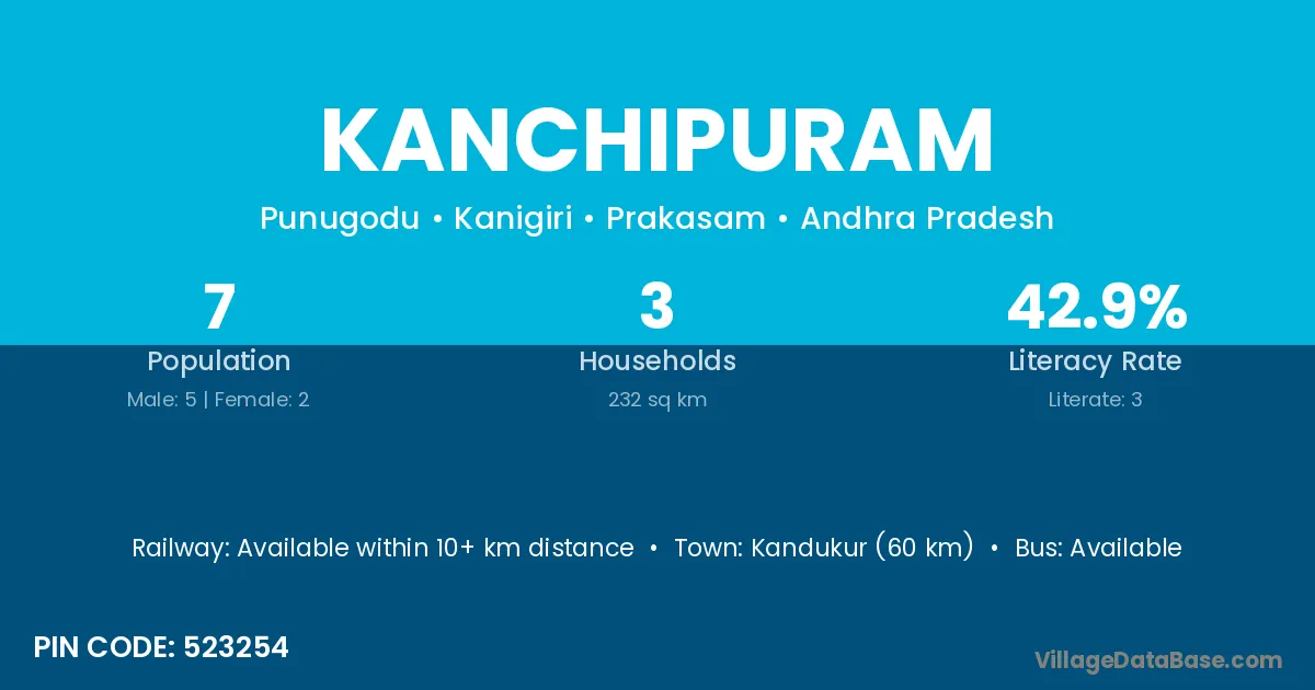 Kandukur (60 km) is the nearest town to Kanchipuram village for major economic activities and is located approximately 60 km away.