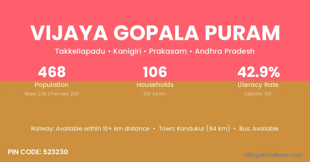 Vijaya Gopala Puram village has a total population of 468 people, of which 235 are males and 233 are females.