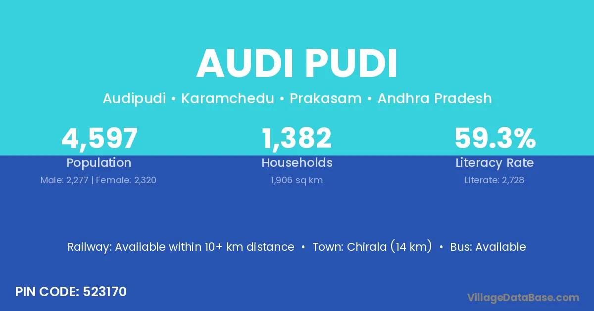 Chirala (14 km) is the nearest town to Audi Pudi village for major economic activities and is located approximately 14 km away.
