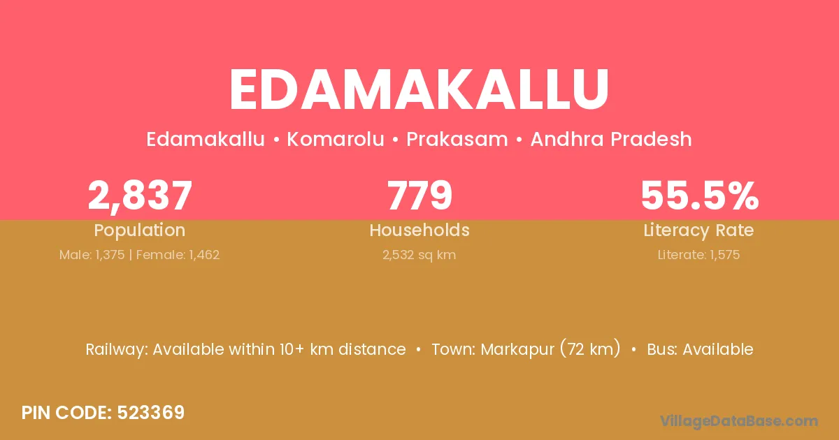 Markapur (72 km) is the nearest town to Edamakallu village for major economic activities and is located approximately 72 km away.