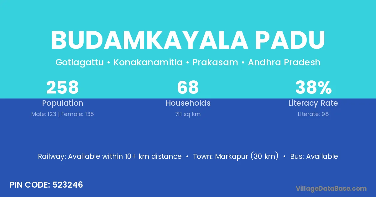 Markapur (30 km) is the nearest town to Budamkayala Padu village for major economic activities and is located approximately 30 km away.