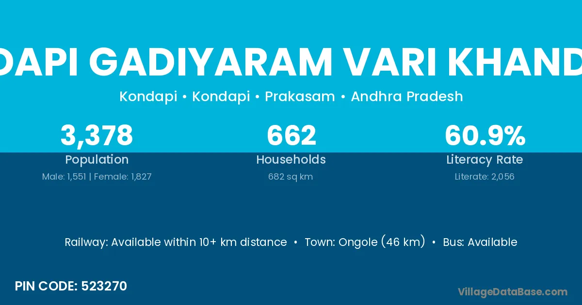 Ongole (46 km) is the nearest town to Kondapi Gadiyaram Vari Khandrika village for major economic activities and is located approximately 46 km away.