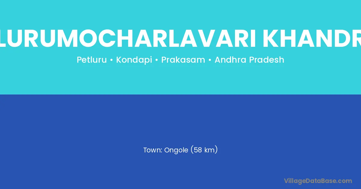 Ongole (58 km) is the nearest town to Petlurumocharlavari Khandrika village for major economic activities and is located approximately 58 km away.