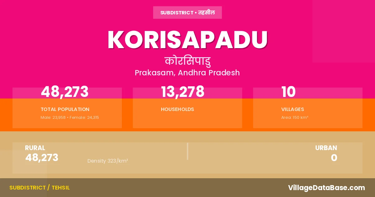 According to the 2011 census The total area of Korisapadu Mandal is 150 km², with a population of 48273 people. The population density is 323 inhabitants per square kilometre, and there are approximately 13278 houses in the sub district.