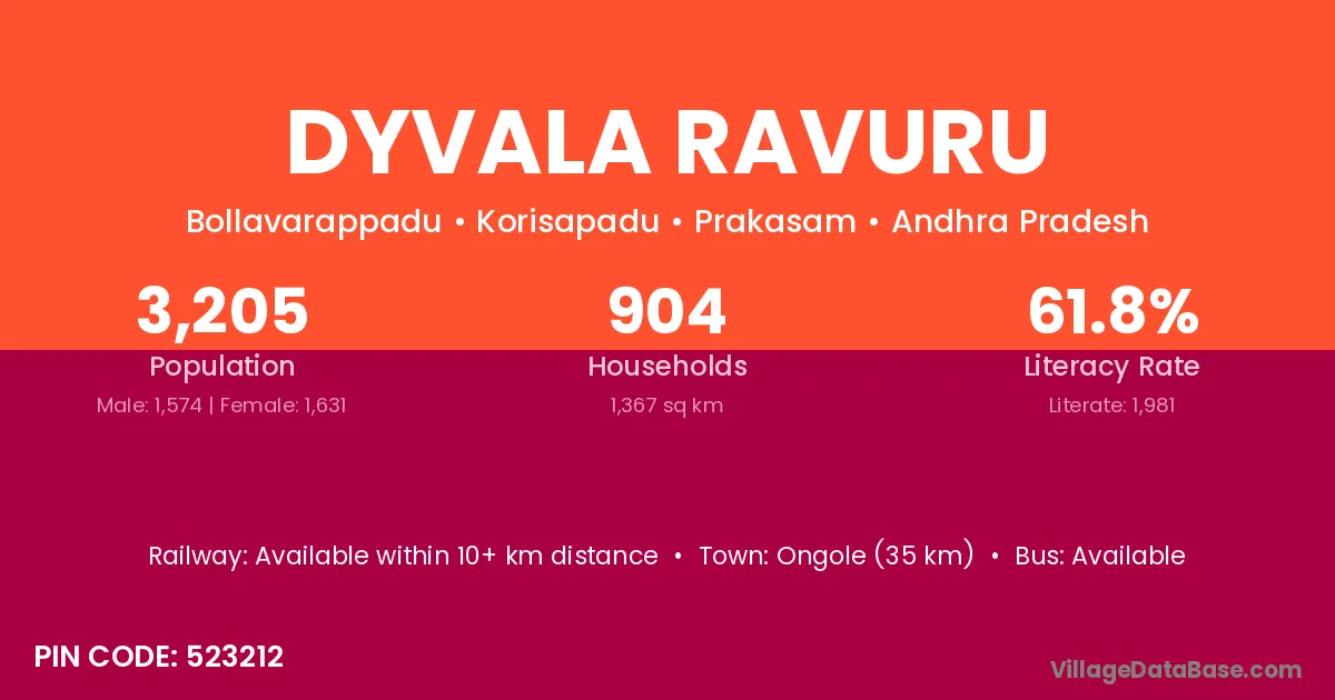 Ongole (35 km) is the nearest town to Dyvala Ravuru village for major economic activities and is located approximately 35 km away.