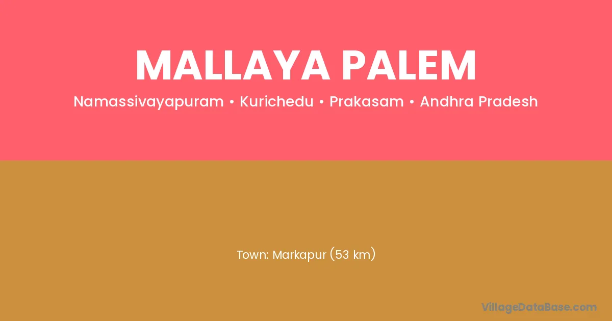 Markapur (53 km) is the nearest town to Mallaya Palem village for major economic activities and is located approximately 53 km away.