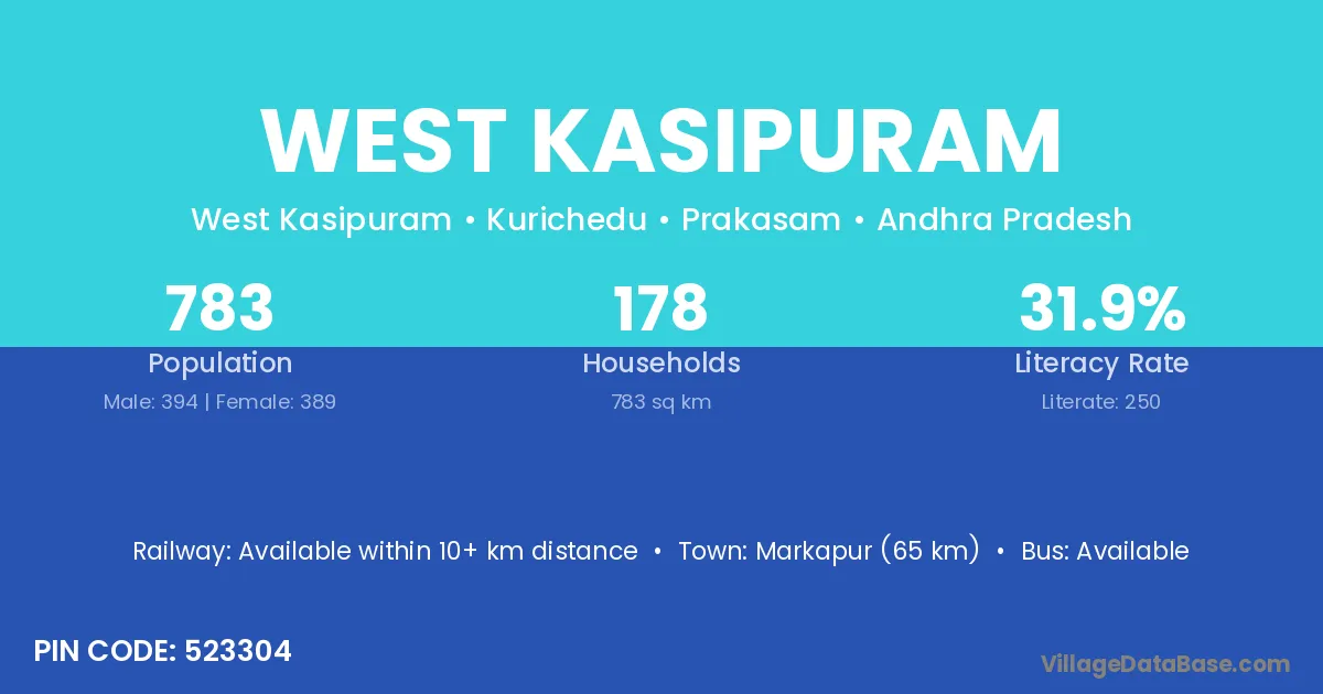 West Kasipuram village has a total population of 783 people, of which 394 are males and 389 are females.
