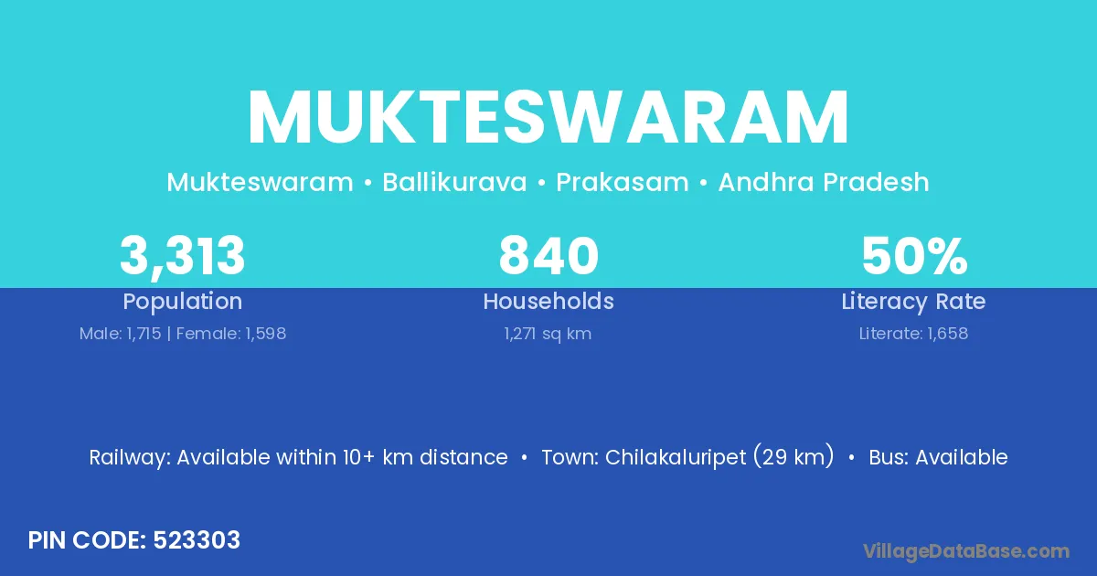 According to Census 2011 information, the village code of Mukteswaram village is 523113.