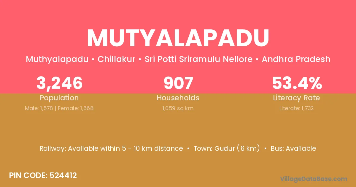 Mutyalapadu village has a total population of 8,460 people, of which 3,960 are males and 4,500 are females.