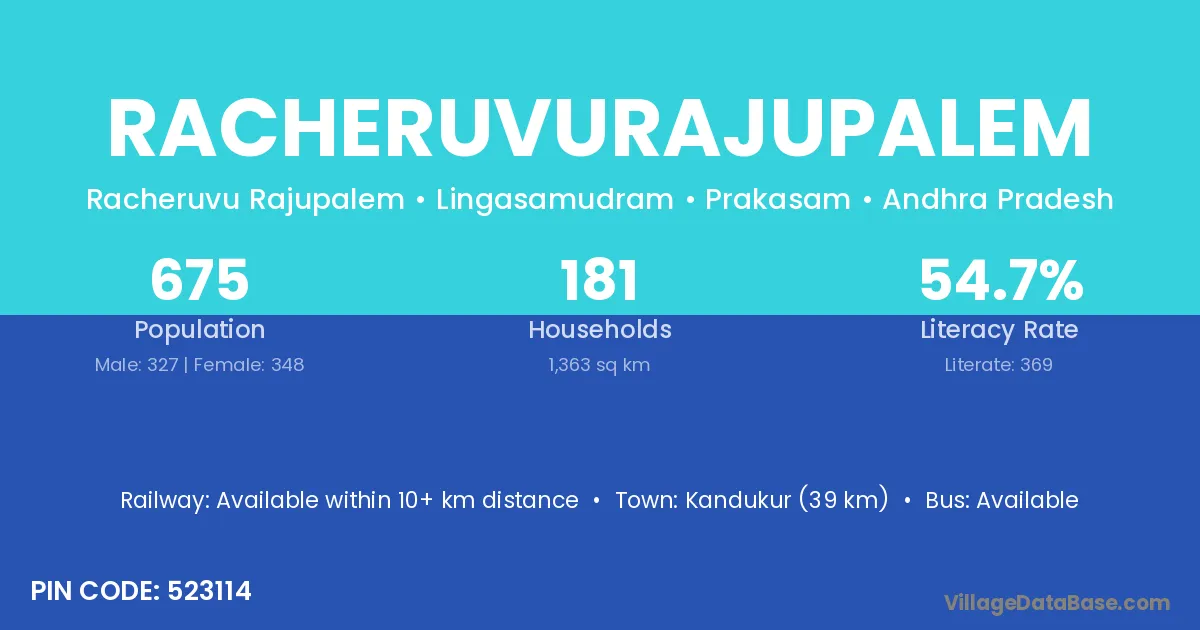 Kandukur (39 km) is the nearest town to Racheruvurajupalem village for major economic activities and is located approximately 39 km away.