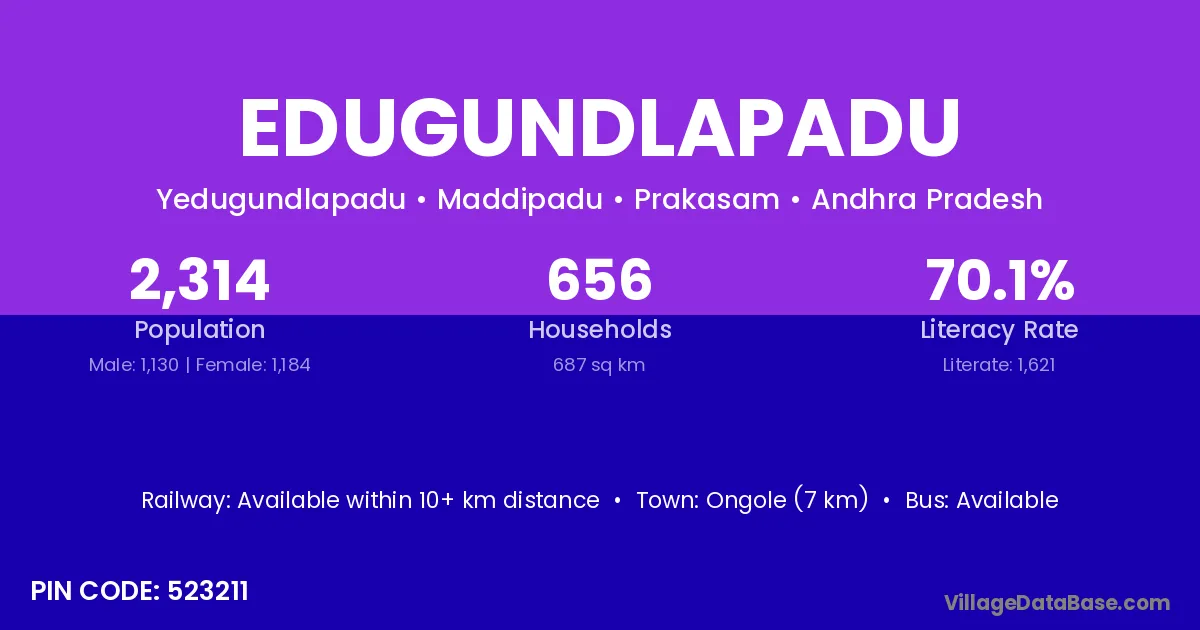 Ongole (7 km) is the nearest town to Edugundlapadu village for major economic activities and is located approximately 7 km away.