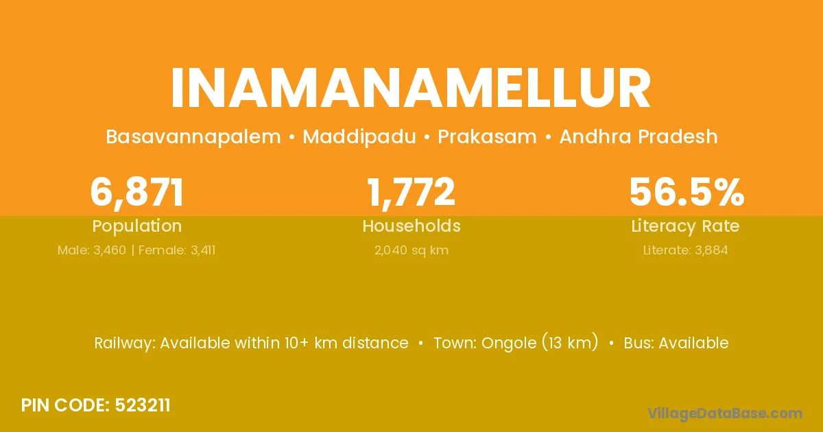 Ongole (13 km) is the nearest town to Inamanamellur village for major economic activities and is located approximately 13 km away.