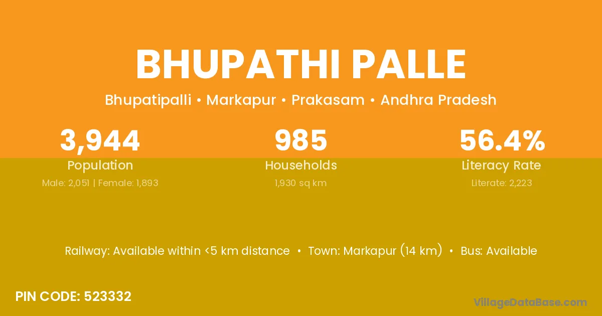 Markapur (14 km) is the nearest town to Bhupathi Palle village for major economic activities and is located approximately 14 km away.