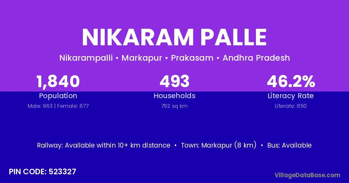 Markapur (8 km) is the nearest town to Nikaram Palle village for major economic activities and is located approximately 8 km away.