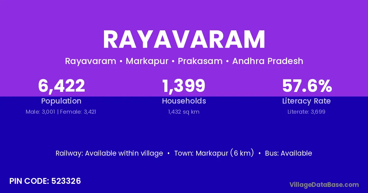 Markapur (6 km) is the nearest town to Rayavaram village for major economic activities and is located approximately 6 km away.