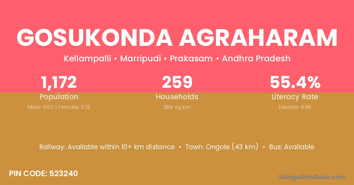 Ongole (43 km) is the nearest town to Gosukonda Agraharam village for major economic activities and is located approximately 43 km away.