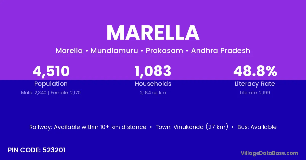 Vinukonda (27 km) is the nearest town to Marella village for major economic activities and is located approximately 27 km away.
