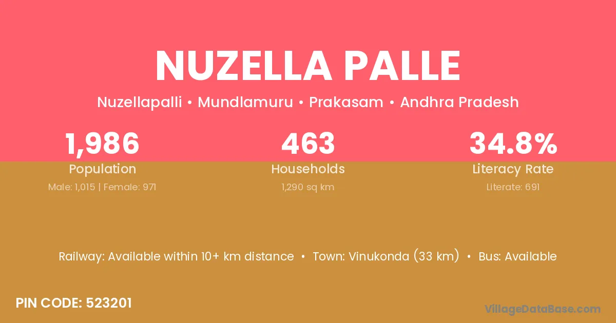 Vinukonda (33 km) is the nearest town to Nuzella Palle village for major economic activities and is located approximately 33 km away.