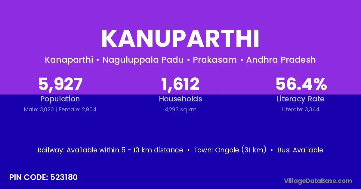 Ongole (31 km) is the nearest town to Kanuparthi village for major economic activities and is located approximately 31 km away.