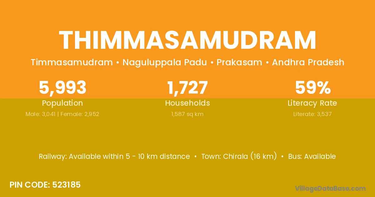 Chirala (16 km) is the nearest town to Thimmasamudram village for major economic activities and is located approximately 16 km away.