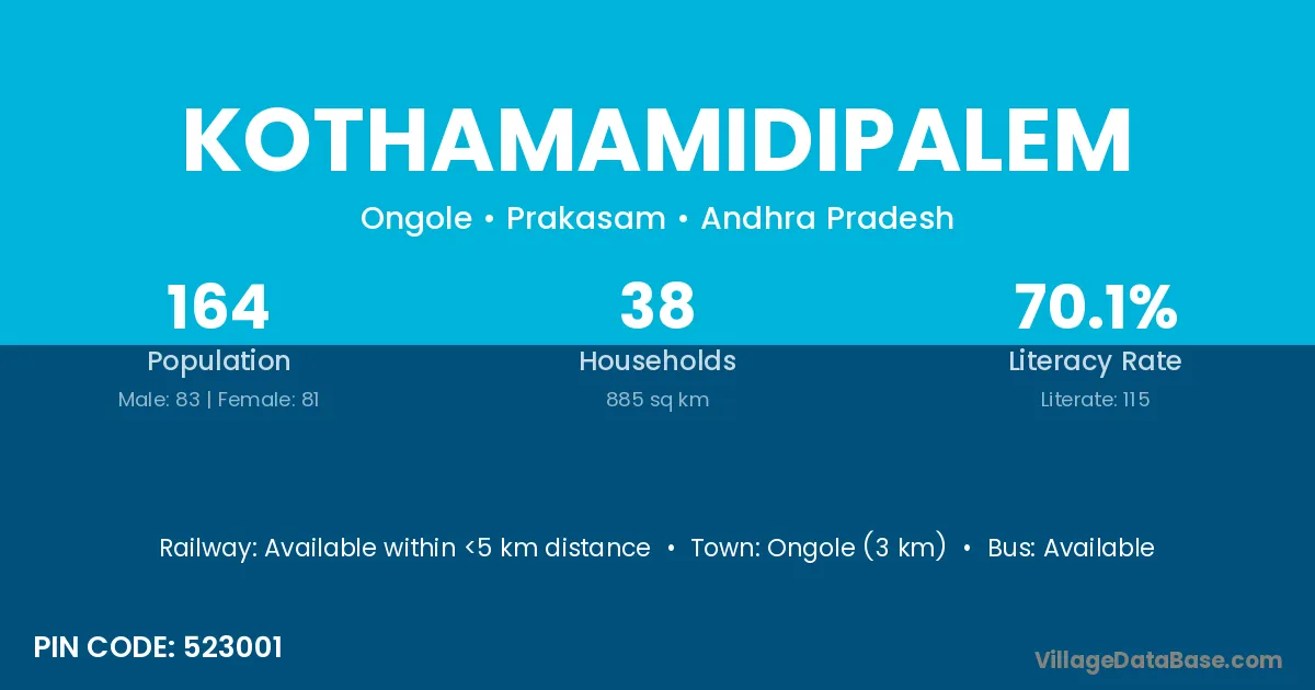 Kothamamidipalem village has a total population of 164 people, of which 83 are males and 81 are females.