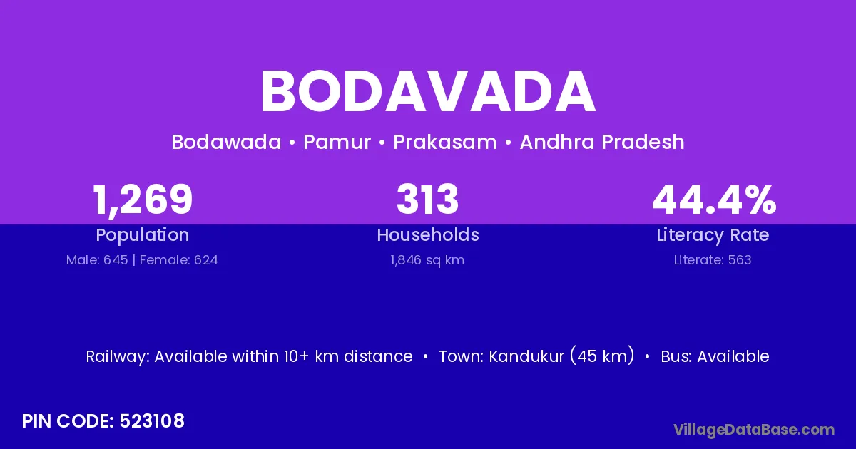 Kandukur (45 km) is the nearest town to Bodavada village for major economic activities and is located approximately 45 km away.