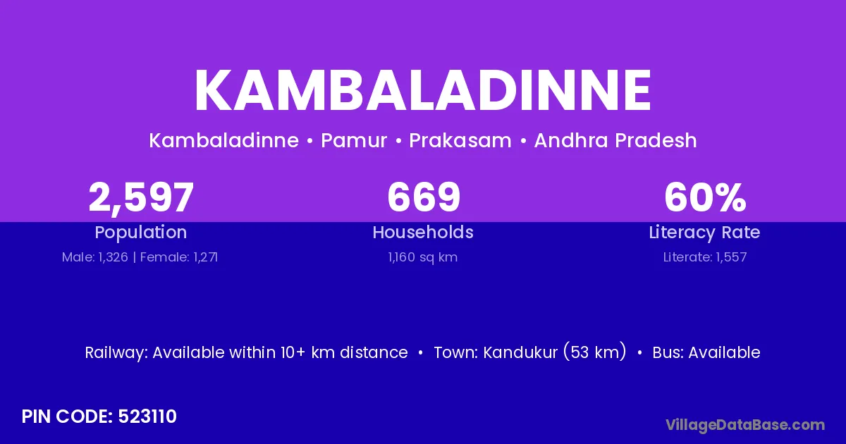 Kandukur (53 km) is the nearest town to Kambaladinne village for major economic activities and is located approximately 53 km away.