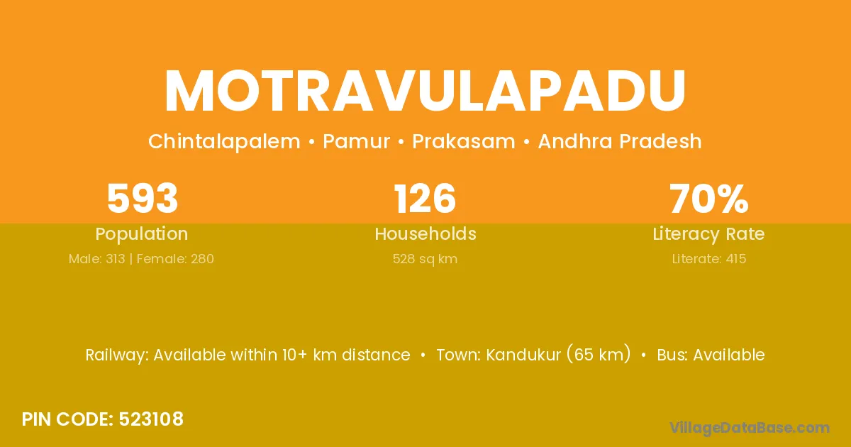 Motravulapadu village has a total population of 593 people, of which 313 are males and 280 are females.
