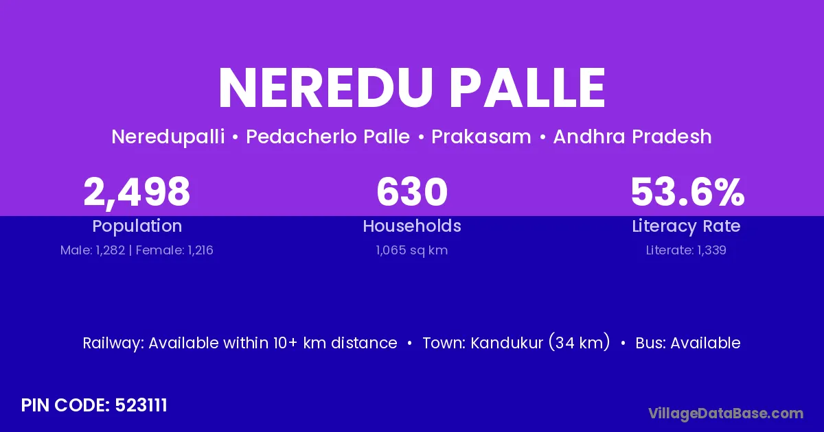 Kandukur (34 km) is the nearest town to Neredu Palle village for major economic activities and is located approximately 34 km away.