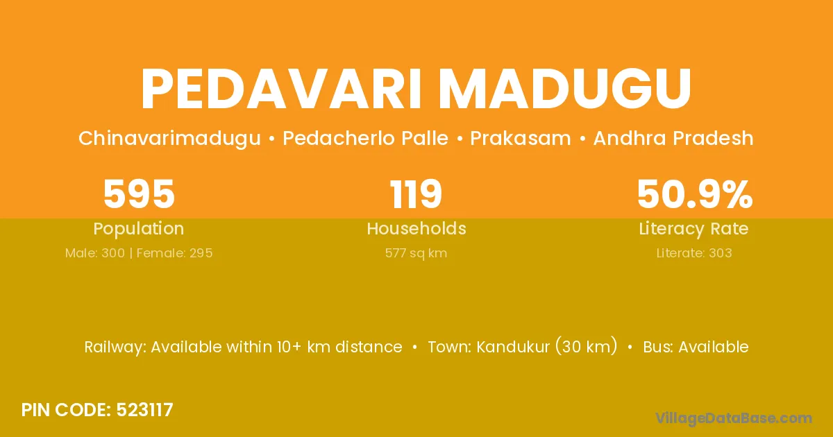 Kandukur (30 km) is the nearest town to Pedavari Madugu village for major economic activities and is located approximately 30 km away.